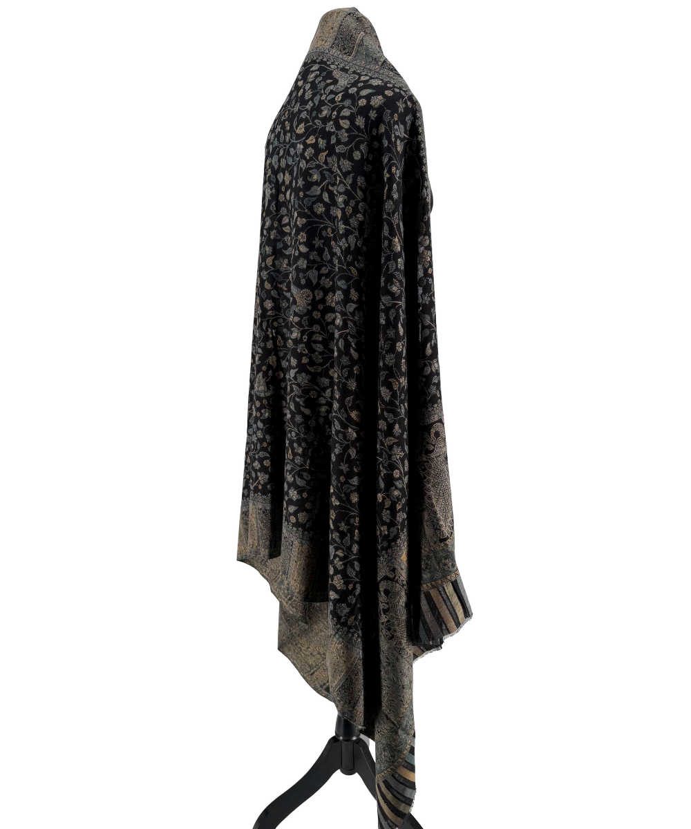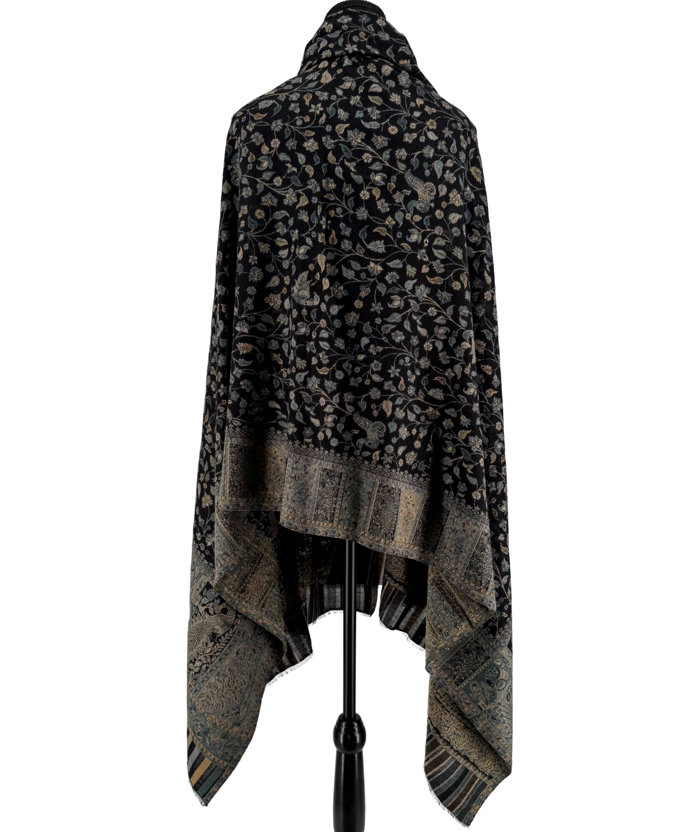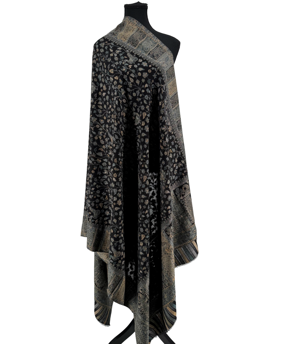 A timeless black handcrafted shawl featuring delicate floral vines and ornate paisley borders, designed for graceful drape and versatile styling.